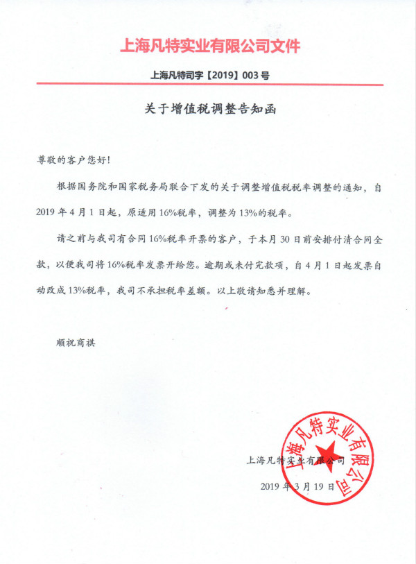 請(qǐng)之前與我司有合同16%稅率開票的客戶,于本月30日前安排付清合同全款,以便我司將16%稅率發(fā)票開給您。逾期或未付完款項(xiàng),自4月1日起發(fā)票自動(dòng)改成13%稅率,我司不承擔(dān)稅率差額。以上敬請(qǐng)知悉并理解。