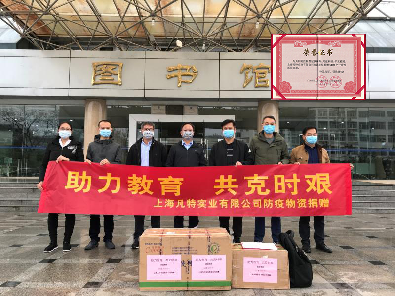 同年2月份,在全國防疫物資緊缺,假冒偽劣口罩泛濫之際,我司在了解到廣西師范大學的復(fù)學復(fù)工情況后,向廣西師范大學后勤保障服務(wù)無償捐贈5000個醫(yī)用口罩等防疫物資,助力其開展復(fù)學復(fù)工及疫情防控工作。樹榜樣、重教育,學習前輩身上不怕苦難、盡職盡責、熱愛人民、熱愛祖國的寶貴品質(zhì),社會才會更好,生活才會更好,上海凡特愿做一個堅實的后盾,與其共克時艱!
