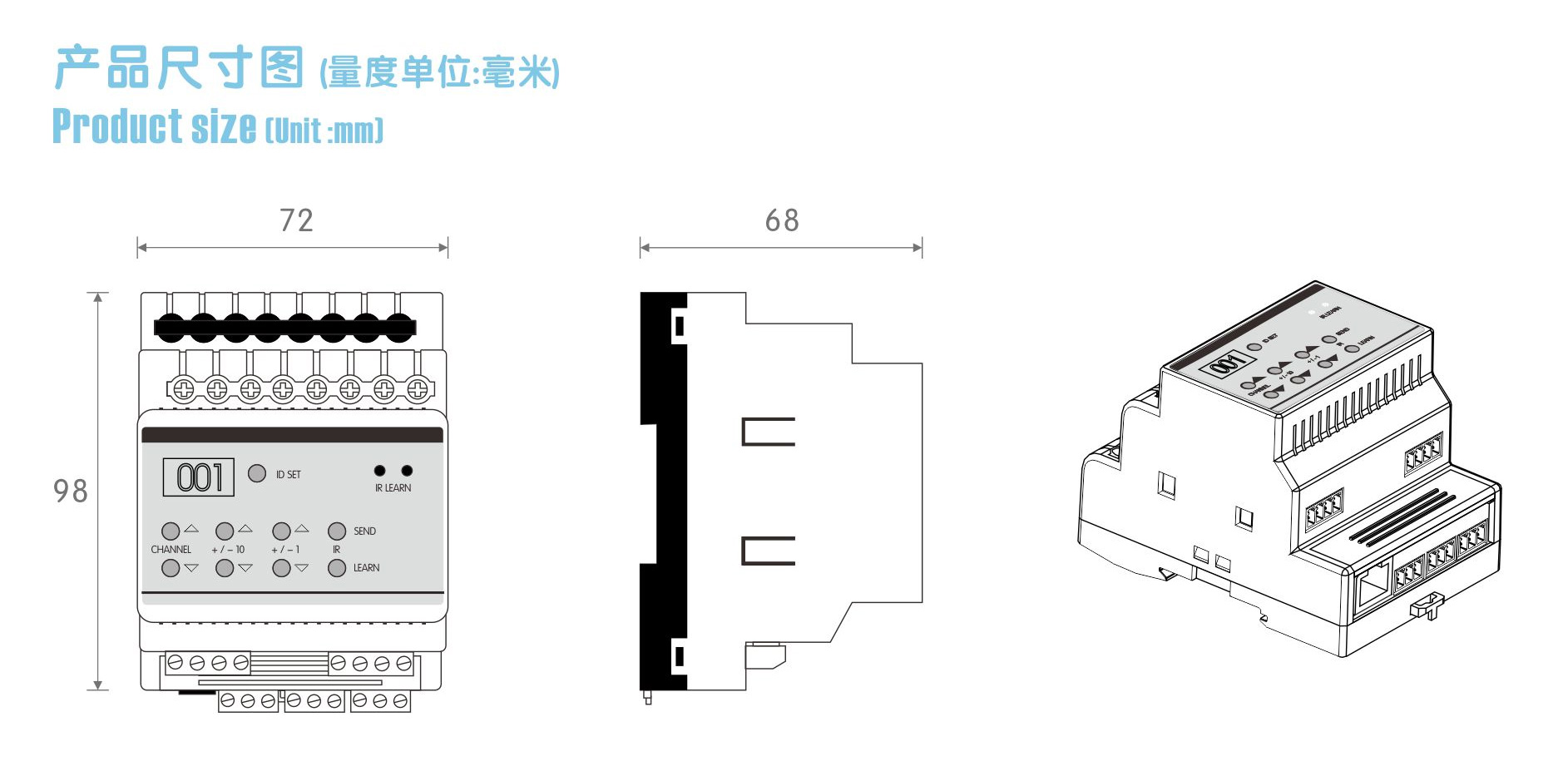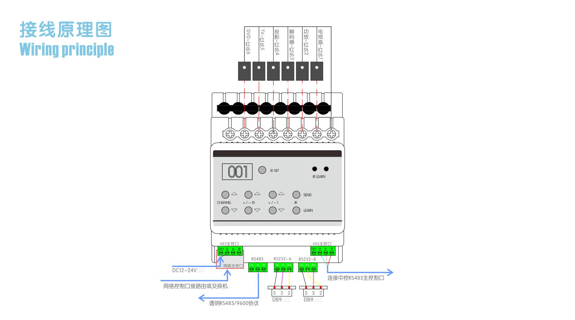本產(chǎn)品為導(dǎo)軌式安裝,含6路紅外輸出,具備強(qiáng)大紅外能力及兼容性可控制6個紅外設(shè)備如電視、DVD、空調(diào)等,2路可編程串口控制投影機(jī)和矩陣等設(shè)備,具備強(qiáng)大紅外能力及兼容性;
